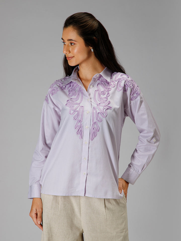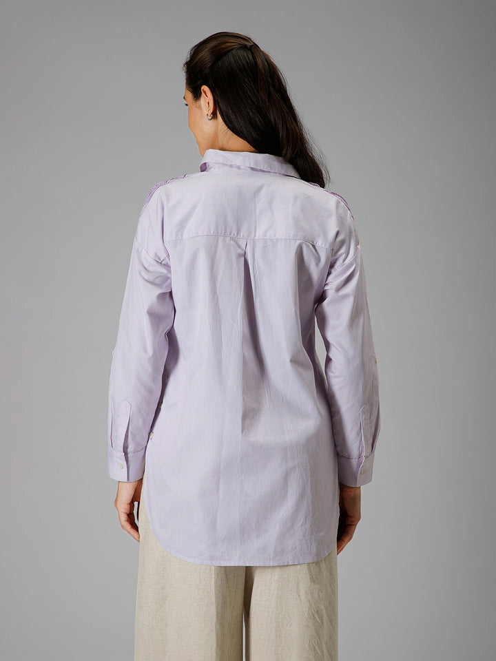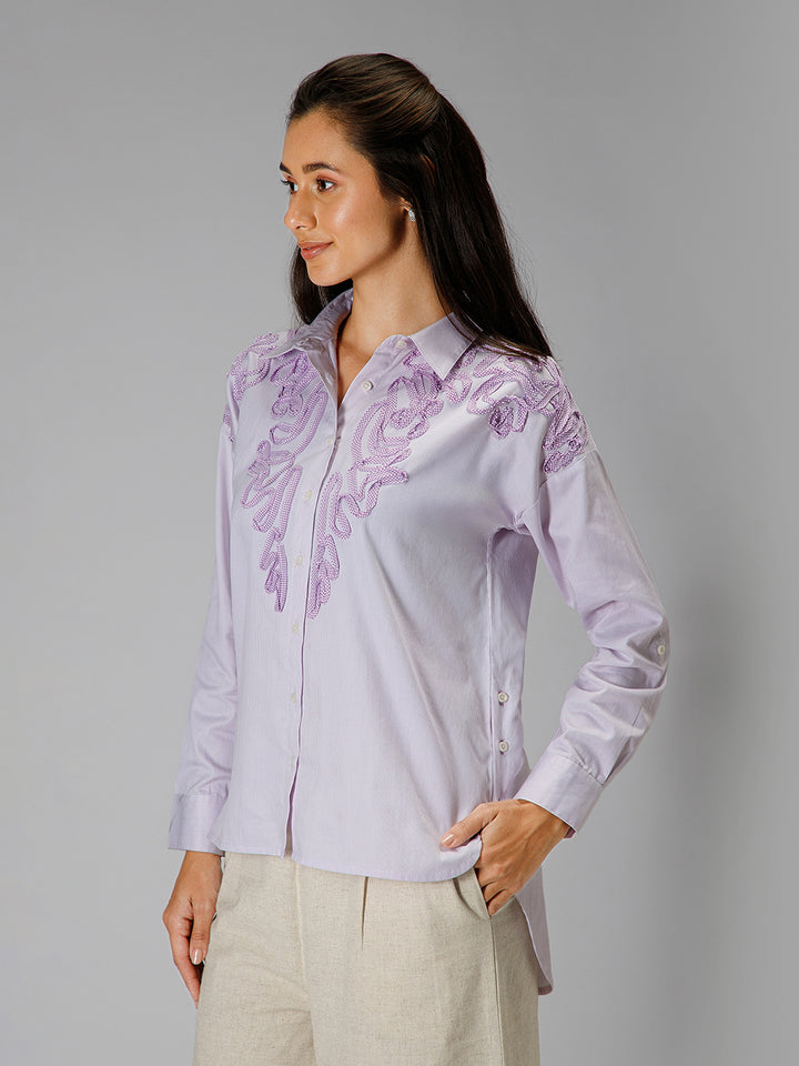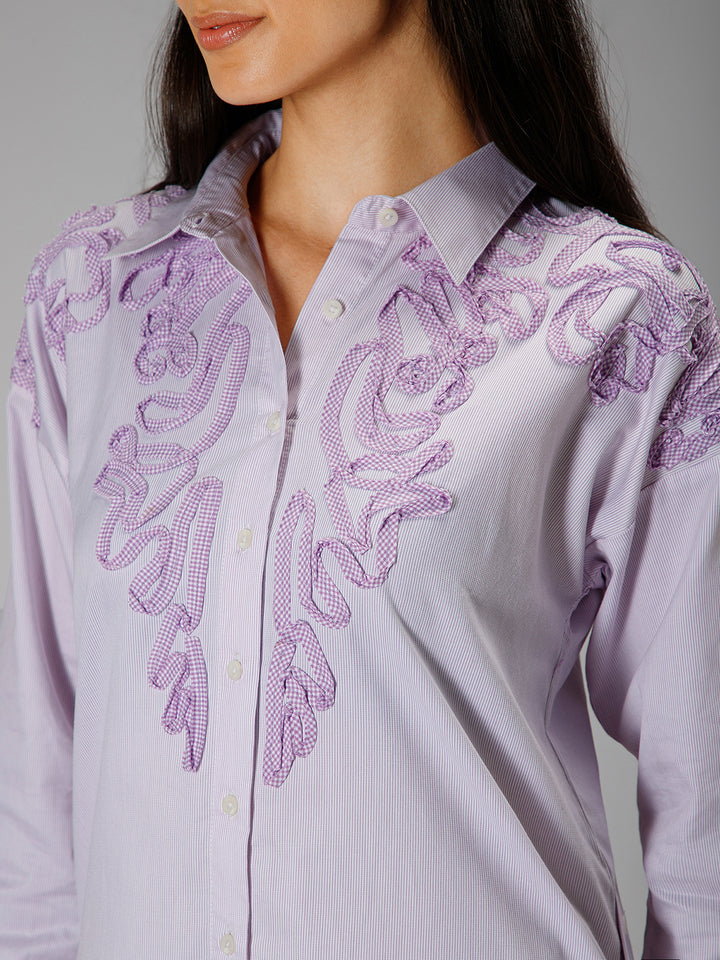Redefine contemporary classics with the Blake Shirt in white with purple stripes. Designed in cotton, this modern essential features fine purple thin stripes and a striking raw edged checkered fabric strip embroidery on the neckline and shoulder, creating an elevated yet edgy detail. Perfectly tailored for comfort and style, Blake transitions seamlessly from boardroom chic to evening sophistication. Pair it with tailored trousers for a sharp office look or style with high-waist skirts for a modern feminine twist. A must-have for those who love statement striped shirts with artisanal embroidery.