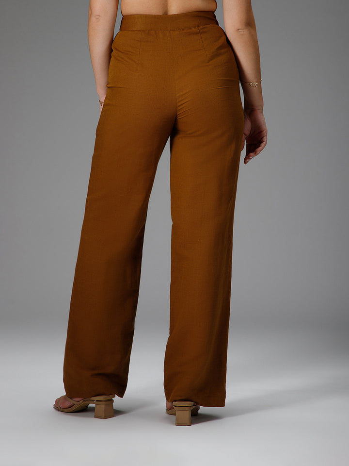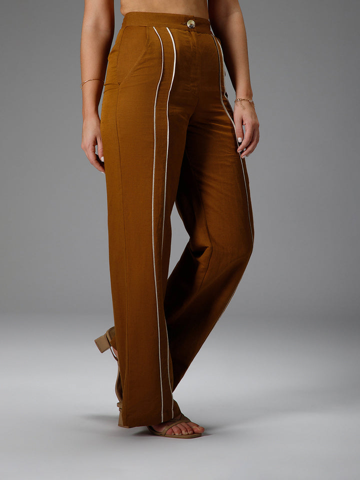 Crafted in a soft cotton-linen blend, these straight-cut camel brown trousers feature subtle beige pipe-in detailing that adds a touch of structure. Designed for all-day comfort, they’re an effortlessly versatile piece for a mindful, modern wardrobe.